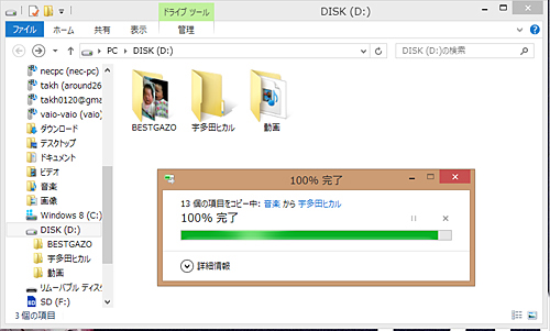 また、PCからもネットワークドライブとして認識するので、好きな端末からアクセスできる。ただし、データ転送速度はUSB 3.0接続と比べると圧倒的に遅いので、大量のデータコピーはUSBケーブルを接続して行いたい。