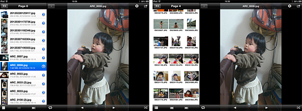 アプリを起動すると、「写真」「音楽」「動画」など、カテゴリ別にデータを表示する。また「フォルダ」を選択すると、PCと同じようなフォルダツリーで表示できる。「写真」では左側に30枚ずつリストを表示し、選んだ画像は右側に表示。写真リストは、サムネイル一覧に切り替えることができ、写真をすばやく探したいときに便利だ。iOS版ではスワイプ操作で拡大縮小ができる。
