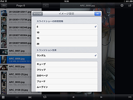 スライドショー表示の表示秒数や切替え効果が設定できる