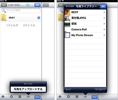 「フォルダ」機能から「写真をアップロードする」を選び(左)、「LHR-DS05WU3」に保存したい写真の格納場所を選択する(右)