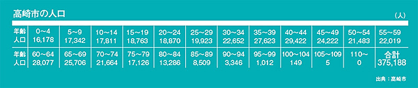 高崎市は、平成の大合併で倉渕村や箕郷町、群馬町、新町、榛名町、吉井町などを編入し、人口が37万5188人、面積が459.41km2と、県内一の人口と広大な市域をもつに至った。県のなかでは、県庁所在地の前橋市が行政の街、高崎市が商業の街として位置づけられる。