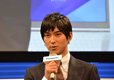 製品発表会には、昨年から引き続きCMキャラクターを務める俳優の松田翔太さんが登場した。松田さんはデキるビジネスマンをイメージした細身のスーツ姿で登場。ポスターの撮影では、新「Let'snote」の“ビジネスをデスクから解き放て”を表現するため、ワイヤーを使ってジャンプしているシーンを撮影したという。