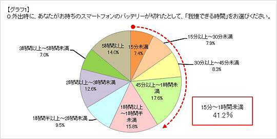 「外出時、スマートフォンのバッテリが切れて我慢できる時間」を問う質問には、41.2%が「1時間以上の電池切れは我慢できない」と回答。スマートフォンが常時利用できる状態でなければ不満を抱くユーザーが多いことが明らかになった。