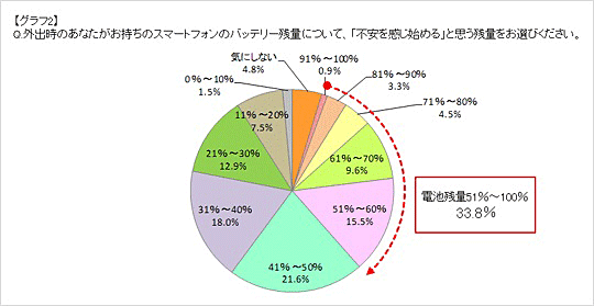 「電池残量への不安感」については、3人に1人が、50%以上の電池残量がある段階から電池切れを心配しはじめることが判明。電池切れはなんとしても避けたいという強い警戒感がうかがえる。