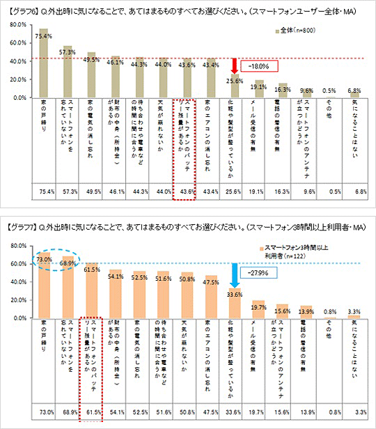 外出時、スマートフォンの電池残量を気にするユーザーは43.6%。1日3時間以上スマートフォンを利用するヘビーユーザーに限定すると、61.5%に上る。これは、「スマートフォンを忘れていないか」(68.9%)や「家の戸締まり」(73.0%)に迫る。また「化粧や髪型が整っているか」という「身だしなみ」に対する意識と比較すると、電池残量を気にするユーザーが27.9ポイント上回るという驚くべき結果になった。