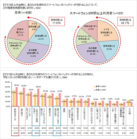 スマートフォンの電池切れへの恐怖感に関する調査では、ユーザーの77.9%が電池切れに恐怖を感じていることが明らかになった。「日常生活において、どのような事柄と同等の恐怖か」という質問の1位は、「財布をなくす」(33.3%)。女性に限定すると、約3人に1人が「人気のない夜道を歩くこと」、約4人に1人が「ゴキブリなどの虫がでること」を挙げた。