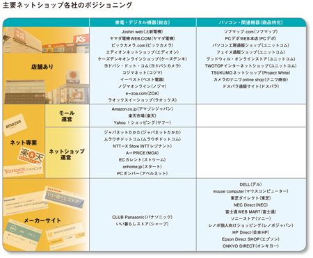 実店舗をもたないネットショップ専業者は、低価格をコンセプトにユーザーを増やしている。ムラウチドットコムは、2005年にムラウチから独立してネットショップに専念。店舗運営コストを削減することで、激安価格での販売を実現した。ノジマは、「PCボンバー」を展開するアベルネットを子会社化して激安家電市場に参入。PCボンバーは、神奈川県を中心にブランド力のあるノジマの傘下に収まることで、ユーザーからの信頼を高めた。