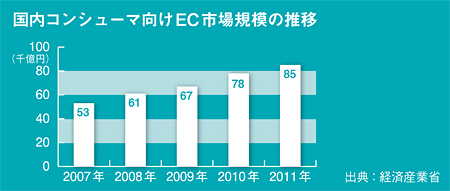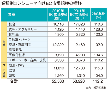 経済産業省によれば、2011年度(2012年3月期)のコンシューマ向け電子商取引(EC)市場は、前年度から8.6%増の約8兆5000億円だった。ほとんどの業種で前年度に比べて市場規模が拡大し、とくに小売業のうち、医薬化粧品、衣類・アクセサリ、食料品は、前年度比20%以上の伸びを示した。家電製品の販売も堅調で、家具・家庭用品、自動車・パーツなどと合わせた市場は、1兆2460億円(2.0%増)という結果だった。