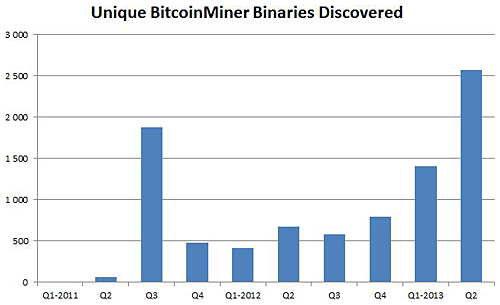 マカフィーは、2013年第2四半期の脅威レポートで、PCのリソースを乗っ取り、ユーザーに気づかれずにBitcoinを生成するBitcoinマイニングマルウェアを紹介。セキュリティ専門家のブライアン・クレブス氏は、自身のブログで、Bitcoinマイニングマルウェアを配布する会員に報酬を支払うアフィリエイトプログラムの存在を報告し、注意を喚起している。