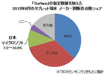 「iPadよりも売れている」のはビックカメラ限定の情報なので、幅を取って「Surface」の販売台数をiPadの±20%と仮定する。この仮定の下、タブレット端末の2013年8月のメーカー別販売台数シェアを計算すると、日本マイクロソフトのシェアは7.5~11.3%となる。これはソニーを抑え、ASUS、アップルに次ぐ市場3位のシェアだ。