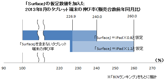 次に、タブレット端末市場の伸び率をみると、「Surface」を含まない8月の前年同月比は226.9%だった。ここに「Surface」の仮定数値を加えると、245.7~255.8%と約2.5倍の伸び率となる。