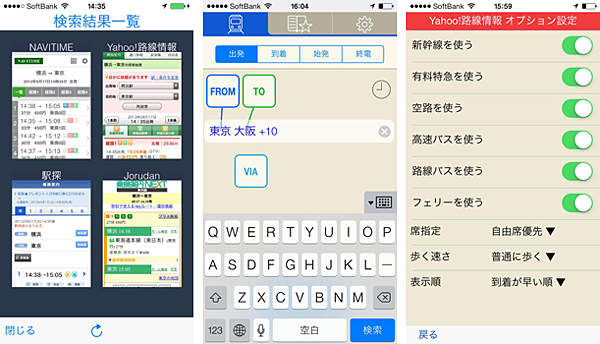 「NAVITIME」「Yahoo! 路線情報」「駅探」「乗換案内NEXT」 の4サイトでの一括検索と結果の表示に対応し、画面をスワイプして簡単に結果を比較できる。