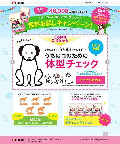 総合ペットフードメーカーのペットラインは、ドッグフード「メディコート<ボディコンディション>」を抽選で合計4万人にプレゼントする「メディコート ボディコンディション 無料お試しキャンペーン」をキャンペーンサイトで開始した。