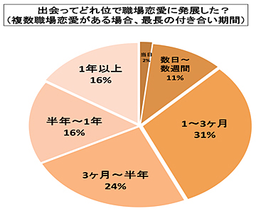 ヒューマニックが7月11日に全国の15歳以上のアルバイトを含む就業経験者男女を対象に実施した「職場恋愛調査」によると、出会ってから職場恋愛に発展した期間は「1~3か月」が3割を占めた。スキー場で異性が格好よく、またはかわいく見えてしまう「ゲレンデマジック」の調査では、ゲレンデマジック経験者のうち、異性が「3割増し」によく見えたと回答した男性が34.8%、女性が57.1%だった。これらの結果から、泊まり込みが多いリゾートバイトは、出会いを求める若者にもってこいの環境で、異性にアピールする絶好のチャンスであることがわかる。