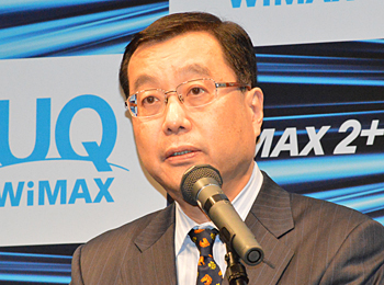 発表会に登壇した野坂章雄代表取締役社長は、「『WiMAX 2+』は、UQが7月に割当てを受けた新規周波数20MHzを利用したサービス。新規周波数帯は、現行の『WiMAX』」の周波数帯30MHzと連続していて、合わせて50MHzからなる周波数帯による一体的な展開によって、容量拡張と通信速度の高速化を実現した」と新サービスの特徴を説明。「『WiMAX 2+』を普及させて、2014年3月までに国内最速の下り速度最大220Mbpsを目指す」と語った。