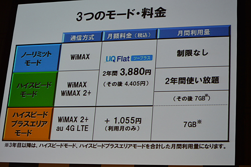 サービス開始と同時に、「HWD14」の通信方式に対応する料金プラン「UQ Flat ツープラス」を提供する。課金開始月から25か月間は「ノーリミットモード」「ハイスピードモード」が速度制限なしで利用でき、月額料金は「UQ Flatツープラスおトク割」を適用して3880円。「au 4G LTE」に対応する「ハイスピードプラスエリアモード」を使用した月だけ1055円のLTEオプション料を追加し、月額料金は4935円になる。