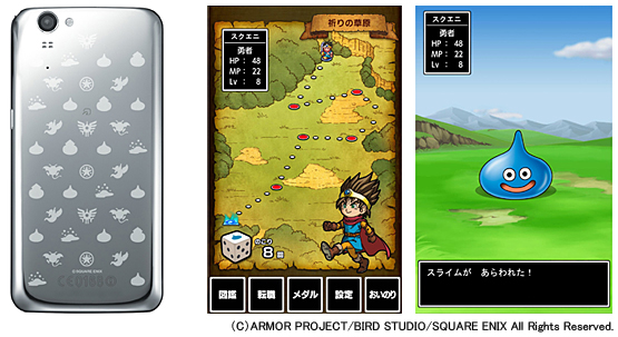 「ドラゴンクエスト」とコラボレーションしたスマートフォンと、着信や歩数など、スマートフォンの利用によってレベルがあがるオリジナルゲーム「ドラゴンクエスト いつでも冒険ダイス」の画面(イメージ)