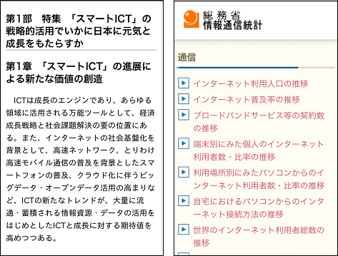 「情報通信白書」閲覧画面(左)と「情報通信統計」閲覧画面