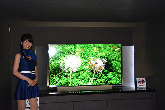 同じく有機ELテレビを参考展示したのは、今年10月に4K対応テレビを発売するパナソニック。「4K WORLD」と題したブース中央にシアターを設置し、そのなかで55型の4K有機ELディスプレイを展示している。色再現性の高さやコントラスト比の高さも驚きだが、8.9mmというその薄さは一見の価値ありだ。