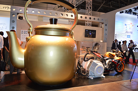 ホンダブースの巨大なヤカンはバイクの排熱でお湯を沸かす仕組みをイメージ