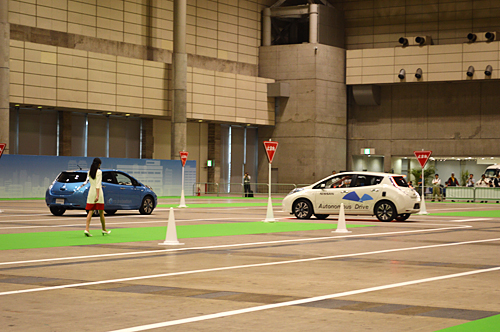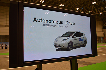 自動車メーカーが出展している隣のホールでは、試乗のためのデモコースがある。ここで目を引いたのが、日産自動車が行っていた自動運転技術のデモンストレーションだ。自動運転とは、障害物を回避しての走行や車線変更、標識の認識などを自動で行う技術。日産は、2020年までに自動運転技術を搭載した自動車の実用化を目指している。