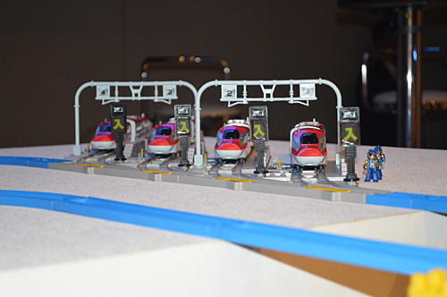 対談の後には、本番で使用する8m×8段ユニットのレール2台でテスト走行が行われた。車両はユニットの最上段からスタートとし、最下段まで走るとそのまま会場に用意されたジオラマへ。急なカーブや傾斜のあるコースを力強く走行し、ギネス記録達成への期待感を高めた。