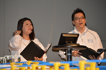 2009年から交流がスタートした両社は、プラレール博やプレゼントキャンペーンなどでコラボレーション。「エボルタ」の液モレ防止性能の安全性と信頼性が、子供が使う玩具であるプラレールとマッチするという。浅見さんは「4kmのコースを作成するためには、プラレールの直線レールが2万本以上必要。本番では長さ8m×8段ユニットを30~40台用意しなければならない」と今回の挑戦の過酷さを説明。檜垣さんは「時間のかかる作業だが、基本に忠実に一本ずつていねいにレールを組み立てることが大事」とアドバイスした。