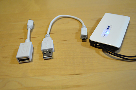 製品には、ミニUSBコネクタをUSBコネクタに変換するケーブルが付属しているので、あとはスマートフォンに対応するUSB充電ケーブルさえ用意しておけば、いつでも緊急用モバイルバッテリとして利用できる。ワンセグ放送の視聴機能を搭載したスマートフォンでも、ワンセグ視聴に熱中してバッテリを使い切ってしまっては元も子もない。その点、バッテリ搭載の「MeoTune」なら安心だし、万が一、スマートフォンがバッテリ切れになったときにも心強い。