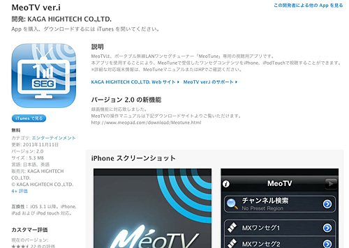 「MeoTune」でワンセグ放送を視聴するアプリ「MeoTV」のiOS版