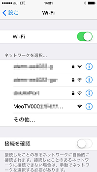 端末のWi-Fi設定で「MeoTV…」を選択。面倒なID・パスワードの入力はいらない