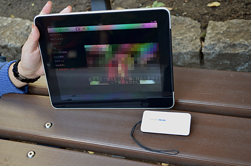 オフィス街の一角にある公園で、実際に「iPhone 5s」(iOS 7.0.2)で試すと、チャンネル検索はすぐに完了。快適に視聴することができた。周囲を高いビルに囲まれた公園だったが、受信状況は良好で、放送画面を拡大したり、フルスクリーン表示にしたりしても、コマ落ちや映像の乱れはなく、非常にスムーズに表示した。
