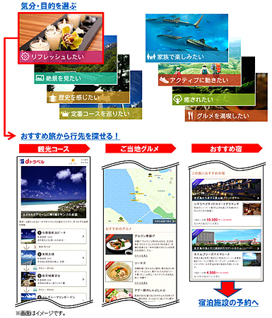 「いやされたい」「絶景を見たい」など、ユーザーの気分や目的に応じて、約1000本のオリジナル「おすすめ旅」を検索でき、写真を豊富に使用したページを雑誌感覚で眺めながら旅行プランを選択できる。