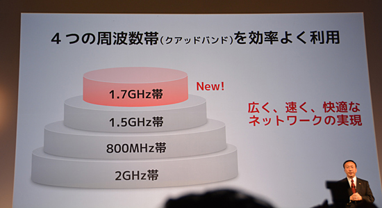 2012年冬モデル以降のAndroidスマートフォンは2GHz/800MHz/1.5GHzのトリプルバンドに対応していたが、2013~14年冬春モデルは、そこに1.7GHz帯を加え、4バンドすべてに対応する。加藤社長は「1.7GHz帯を加えることで、速さとどこでもつながる快適さの両方を提供できる」とした。