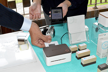 発表会後に行われた実演で、まずは、スマートフォンで印面したいデザインを作成。面倒な設定は一切なく、直感的な操作で誰でも簡単に作業を進めることができる。デザインからスタンプ完成まで、作業時間は15分程度だった。