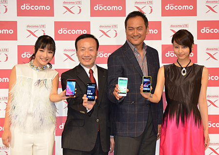 10月10日、NTTドコモの2013~14冬春新商品発表会にイメージキャラクターを務める俳優の渡辺謙さん、女優の堀北真希さん、石原さとみさんの3人が登場し、新端末やサービスをアピールした。