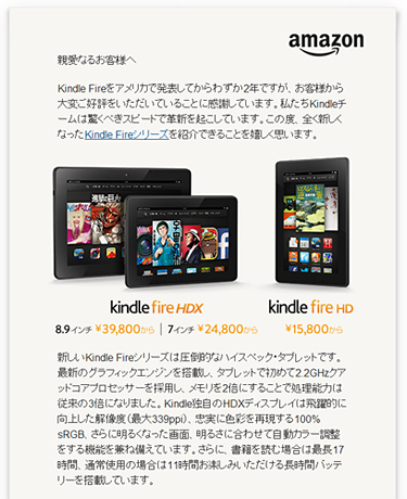 Amazon.co.jpは、10月16日、Kindle Fireシリーズの新モデル「Kindle Fire HDX」の7インチモデルと8.9インチモデル、新しい「Kindle Fire HD」の予約販売を開始した。「Kindle Fire HDX」は11月28日、「Kindle Fire HD」は11月5日から出荷を開始する。