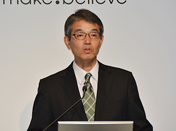発表会の冒頭、SVP イメージング・プロダクツ&ソリューションセクターの副セクター長でデジタルイメージング事業本部の本部長を務める石塚茂樹業務執行役員が登壇。「コンシューマ向け市場では成長セグメントと位置づけたデジタル一眼レフ、ミラーレス一眼、高級コンパクトに力を注ぐ」と説明。さらに、「従来は(デジタル一眼レフの)Aマウントが『α』、(ミラーレス一眼の)Eマウントが『NEX』という呼び名でユーザーに親しまれてきたが、これを統合して、レンズ交換型カメラは全て『α』とする」として、「α」ブランドを前面に押し出していく方針を説明した。