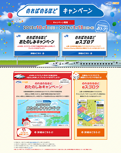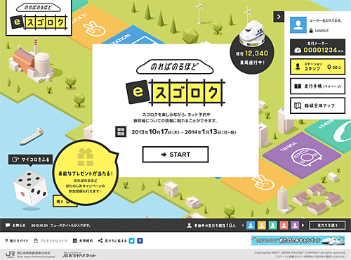 西日本旅客鉄道(JR西日本)は、「のればのるほどキャンペーン」の特設コンテンツとして、ウェブ上でプレイできるスゴロクコンテンツ「のればのるほどeスゴロク」をオープンした。期間は2014年1月13日まで。