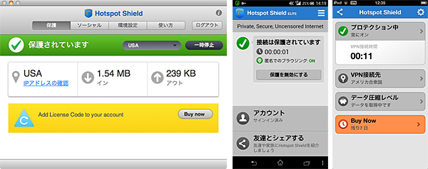 全世界で1.5億回以上のダウンロード実績をもつ、米AnchorFreeのVPNソフト「Hotspot Shield」の有料版「Hotspot Shield Elite」を改題した製品。端末からサーバーへの通信を丸ごと暗号化して、ウイルス対策ソフトでは防ぐことができないネットワーク上の盗聴を防止できる。