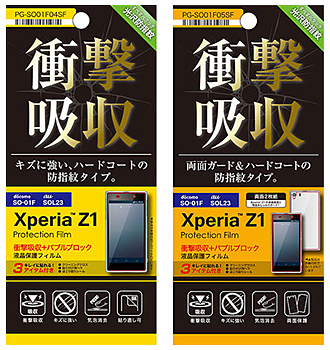 「Xperia Z1」の約5.2インチの大画面ディスプレイを保護する液晶保護フィルムは、「気泡消去」タイプの光沢ハードコートと防指紋(マット)、目に負担をかけるブルーライトを約30%低減する「ブルーライト低減」、キズや衝撃に強い「衝撃吸収+ハードコート」(片面/表裏2枚セット)、指紋や皮脂の付着を防ぐフッ素加工を施し、さらさらした手触りで操作しやすい「フッ素加工」の5種類。さらに、高い透明度とハードコートで背面を美しく保つ「光沢ハードコート」の背面保護フィルム、背面部分をドレスアップする背面デザインフィルム(カーボン調/チェック/ドット/グラフチェック)をラインアップする。