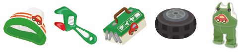 限定ピグアイテム (左から)「オリジナルニット帽」「オリジナルレンチ」「オリジナル工具箱」「限定タイヤクッション」と、「限定オーバーオール」