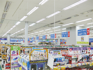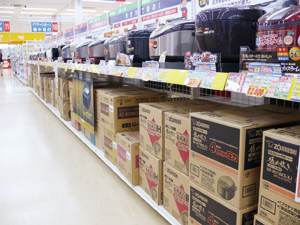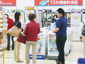 店舗は、1階が白物家電で、2階がパソコンや薄型テレビなどデジタル機器という2フロア構成。お客様がゆったり店内を回ることができるよう、広い通路を確保している。また、展示棚は150cm以下と低くして「お客様が最適な位置から商品を選ぶことができる」(川澄店長)。さらに、展示商品の下には在庫を置いて、「在庫があることを確認していただく」陳列も、お客様を増やしている要因だ。店側にとっては、広い通路でお客様を見つけやすいほか、棚が低いので、お客様がスタッフを探している様子を把握することができ、また在庫の陳列でスタッフがバックヤードに商品を取りに行く手間を省くことができる。お客様への気配りと業務効率につながっているわけだ。