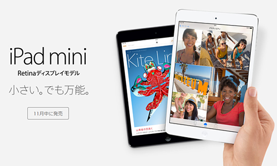 アップルは、10月23日、美しい7.9インチの「Retinaディスプレイ」やA7チップを搭載した「iPad mini Retinaディスプレイモデル」を発表した。11月中に発売する予定。