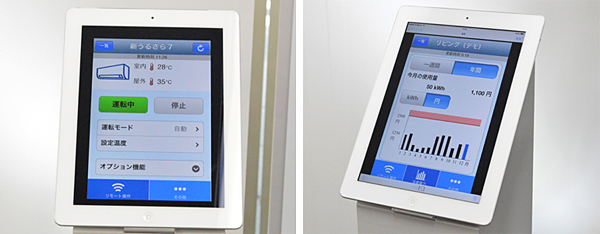 スマートフォンによる遠隔操作には「お知らせ通知」機能を追加。一定時間、部屋に人がいないのを検知すると、スマートフォンに通知して消し忘れを防止する。留守宅の家族を見守る機能を設定することもでき、高温時には遠隔操作で室温を調整できる。また、電気代をスマートフォンから確認し、グラフで表示することもできる。スマートフォンの接続には、別売の無線LANアダプタが必要。