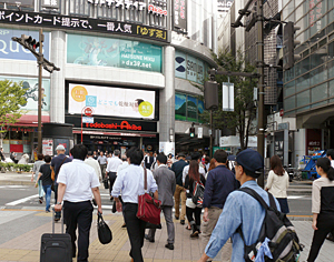 駅隣接のマルチメディアAkibaの周辺は多くの通行人が行き来する