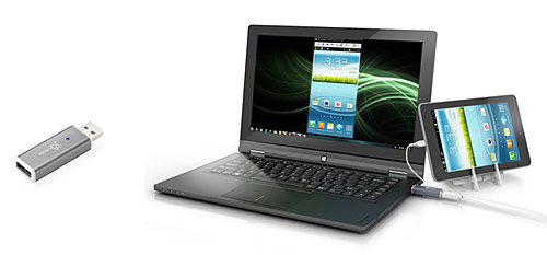 PCとの接続時に、スマートフォンを立てられるスタンドが付属する。対応OSは、PC側がWindows 8.1/8/7/Vista/XP、Android端末側がAndroid 4.2以降/4.1/4.0/2.3。サイズは幅19.0×高さ10.5×奥行き64.0mmで、重さは約15g。