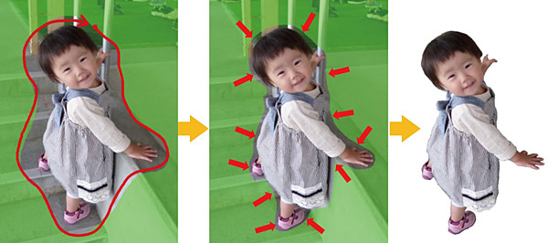 デジタルカメラで撮影した写真や画像の切り抜く部分を大まかになぞるだけの簡単な操作で、人物や動物、花、建物などを切り抜くことができる。