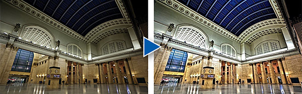 「コンテンツ自動除去」は、画像に写り込んでしまった電線やゴミ、知らない人などを、マウスでなぞるだけで消去。高度な画像解析アルゴリズムによって周囲の画像を自動で補うので、消したいものだけを自然に削除できる。