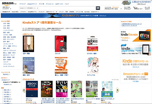 Kindle ストアでは、オープン1周年を記念して、約400点の対象商品を特別価格で提供する謝恩セールを開催する。期間は10月30日まで。