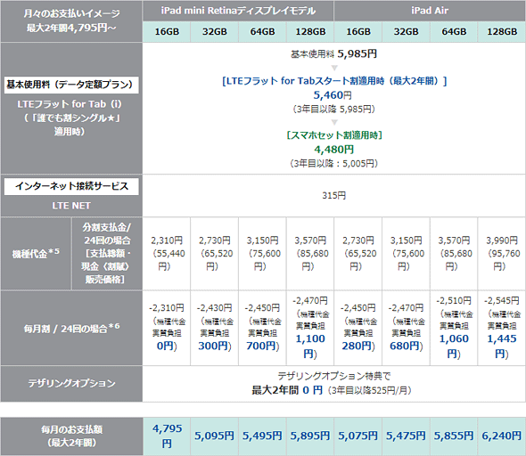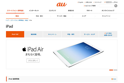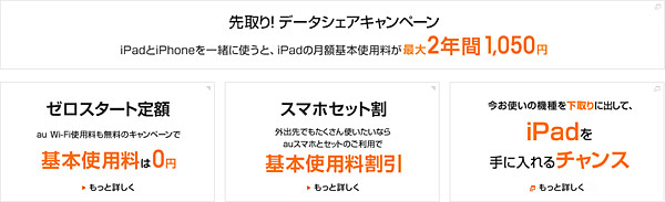料金プラン・キャンペーンは、従来と同じ。機種代金は、「iPad Air」の16GBが6万5520円、32GBが7万5600円、64GBが8万5680円、128GBが9万5760円、「iPad mini Retinaディスプレイモデル」の16GBが5万5440円、32GBが6万5520円、64GBが7万5600円、128GBが8万5680円だが、機種に応じて最大24か月、一定の金額を割り引く「毎月割」適用後の実質負担額は、「iPad Air」が6720円(月額280円×24回)から、「iPad mini Retinaディスプレイモデル」は0円から。さらに、auのスマートフォンとiPadをセットで利用する人向けに、「スマホセット割」「ゼロスタート定額」や「先取り!データシェアキャンペーン」などのセット割引・キャンペーンも実施する。